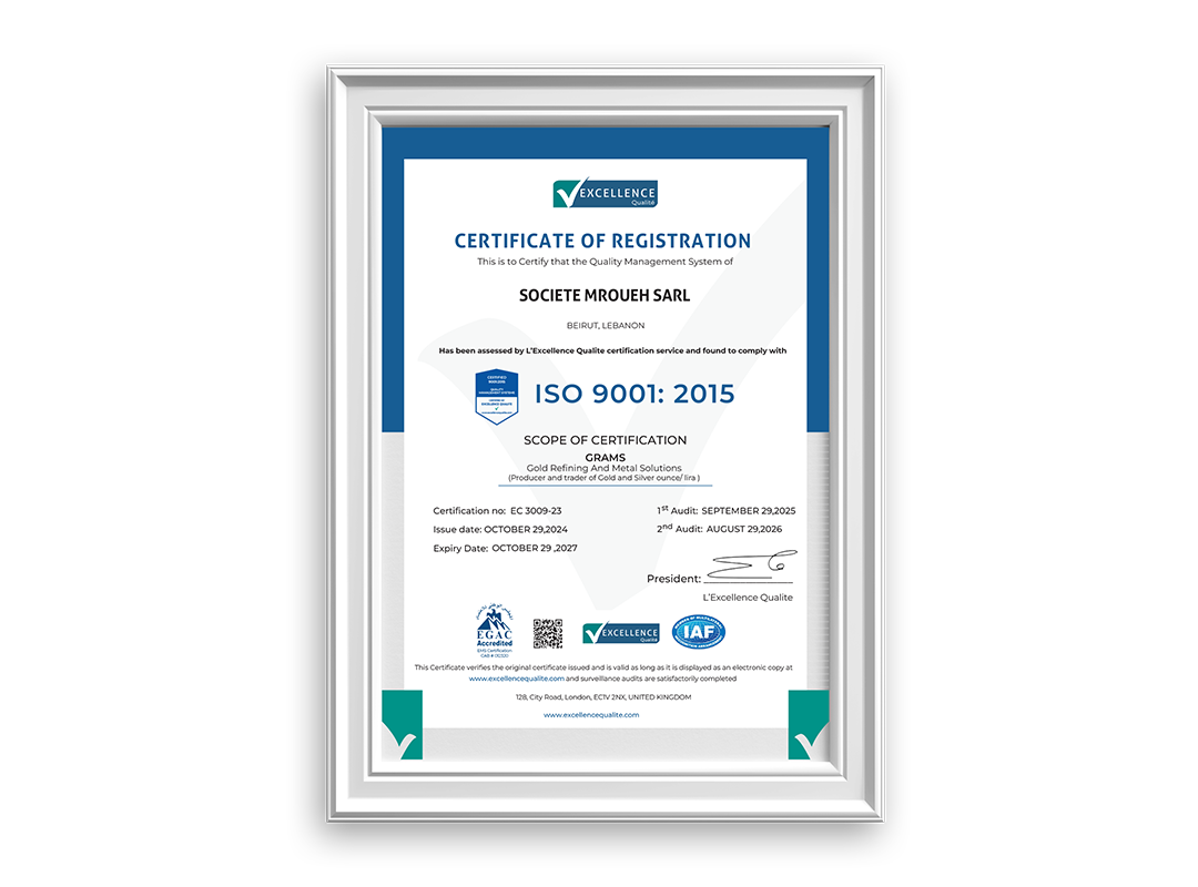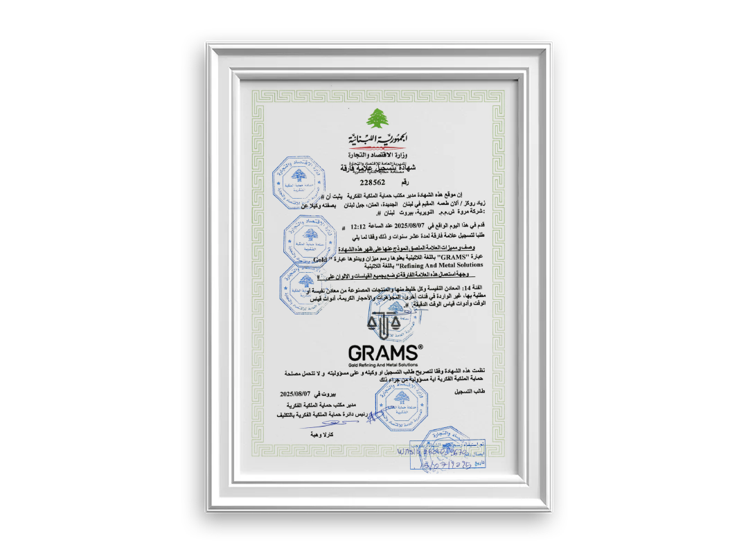 Gold Refining and Metal Solutions has been officially registered and certified by the Lebanese Ministry of Economy and Trade. This prestigious certification grants full legal protection for the brand within Lebanon, confirming its exclusive rights in the field of precious metals and related services. With this recognition, GRAMS reinforces its commitment to authenticity, quality, and industry excellence in the Lebanese market.